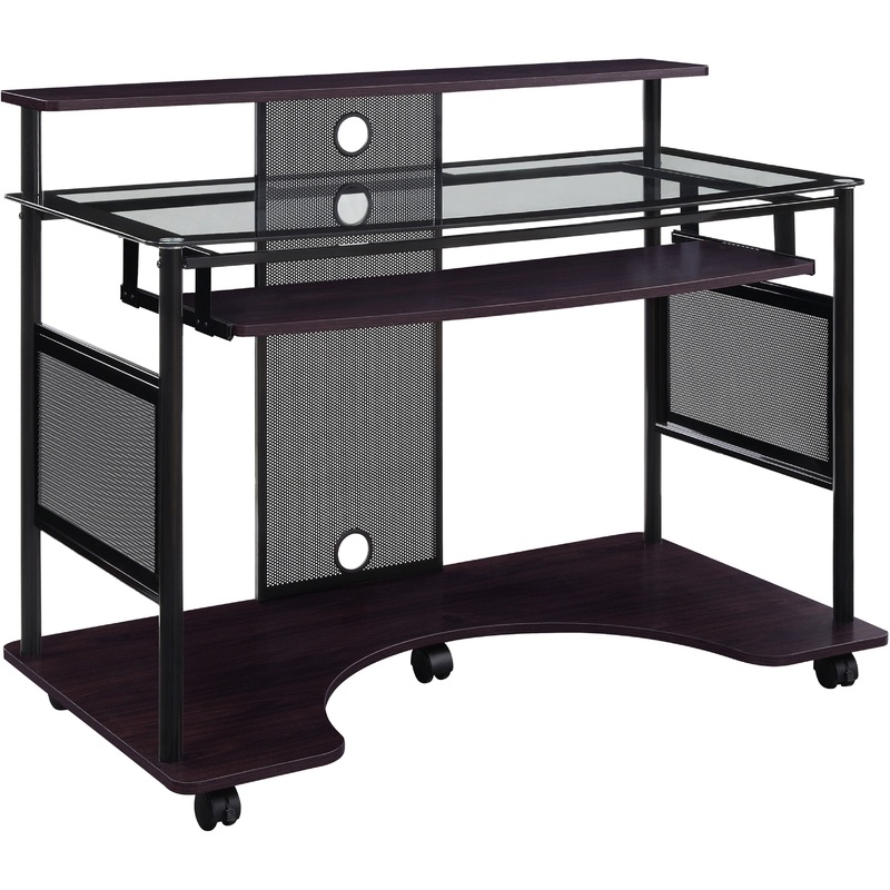 Elevate working from home by upgrading your home office in an effortless style. A clear, tempered safety glass surface with black decorative band and chrome cylinder glass mounts paired with an attractive metal frame provides an airy, open style with loads of workspace potential. Decorative perforated metal privacy screen adds function and visual appeal. The upper glass shelf positions the monitor at the optimum viewing level and keeps the main desktop area clear for multi-functioning tasks. Maintain clean, modern lines by organizing cords and cables with built-in cable management portals. Move and reposition desk smoothly thanks to our heavy-duty locking and carpet casters. Simple, easy-to-follow assembly instructions will get your home office up and running quickly!