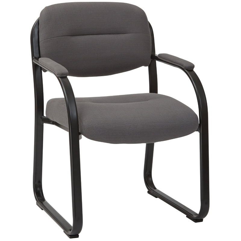 This comfortable visitors chair gives you more bang for your buck. Features: Commercial grade charcoal fabric on the seat and backrestColor coordinated Padded armsTubular steel frame with black scratch resistant finishThe base also has rubber pads to preve