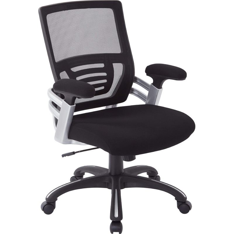 Features: Breathable mesh back with built-in lumbar supportBlack mesh fabric seatOne-touch pneumatic seat height adjustmentLocking tilt control with adjustable tilt tensionAdjustable PU padded armsHeavy duty base with silver accents and dual wheel carpet c
