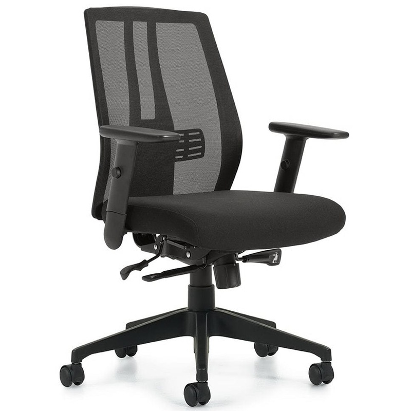 This ergonomically designed office chair from Offices To Go features a black mesh back with black woven fabric seat, adjustable height arms with polyurethane armrests, a synchro-tilt chair control with multiple position tilt lock and tilt tension adjustmen