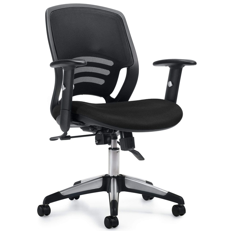 This mesh back office chair from Offices To Go features a screen mesh backrest for maximum ventilation and support. Other features include a thick foam padded seat cushion upholstered in stain-resistant breathable fabric, built-in lumbar support curve, hei
