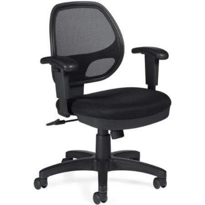 This mesh office chair from Offices To Go features an attractive and supportive screen mesh backrest for maximum airflow and a thickly padded seat cushion upholstered in black mesh fabric. Other features include height-adjustable arms, one-touch pneumatic