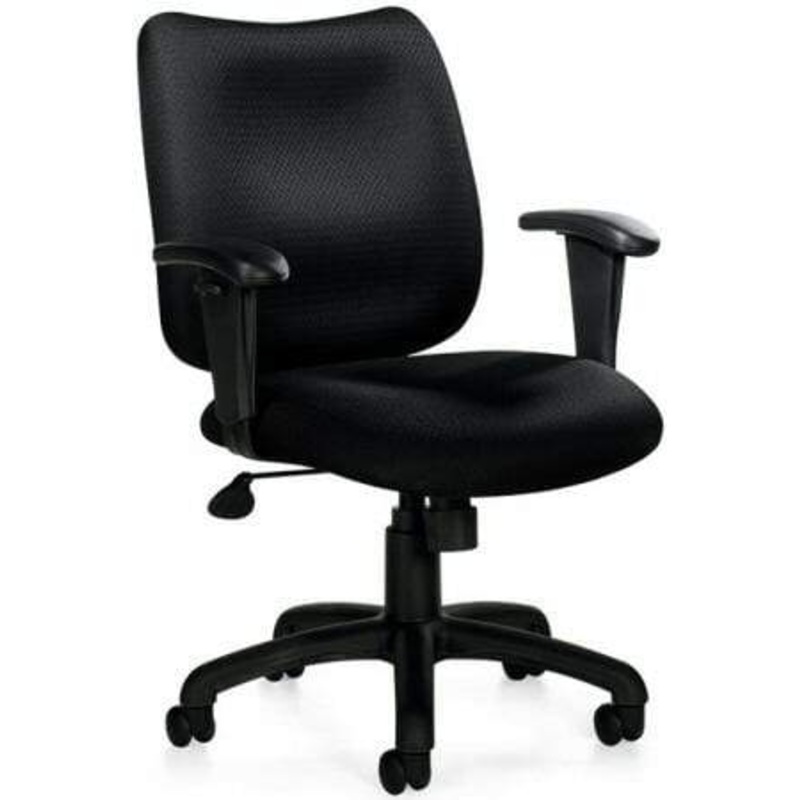 This office task chair from Offices To Go features durable, stain resistant fabric upholstery over thickly padded seat and backrest cushions for all-day comfort. Other features of this task chair include tilt with tilt lock and tilt tension adjustment, pneumatic seat height adjustment, fixed back angle, height adjustable armrests and a durable molded five star angled base with twin wheel carpet casters. This office task chair meets or exceeds ANSI/BIFMA standards.