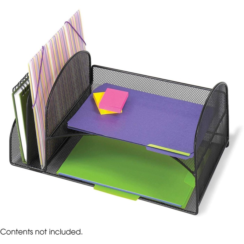 Corral clutter on the desktop with an onyx black organizer. Mesh steel construction with a powder coat finish provides see-through access for two horizontal shelves and a split vertical holder at the side. In the office, it can hold folders or documents for processing. For hobby areas, it can accommodate craft supplies.