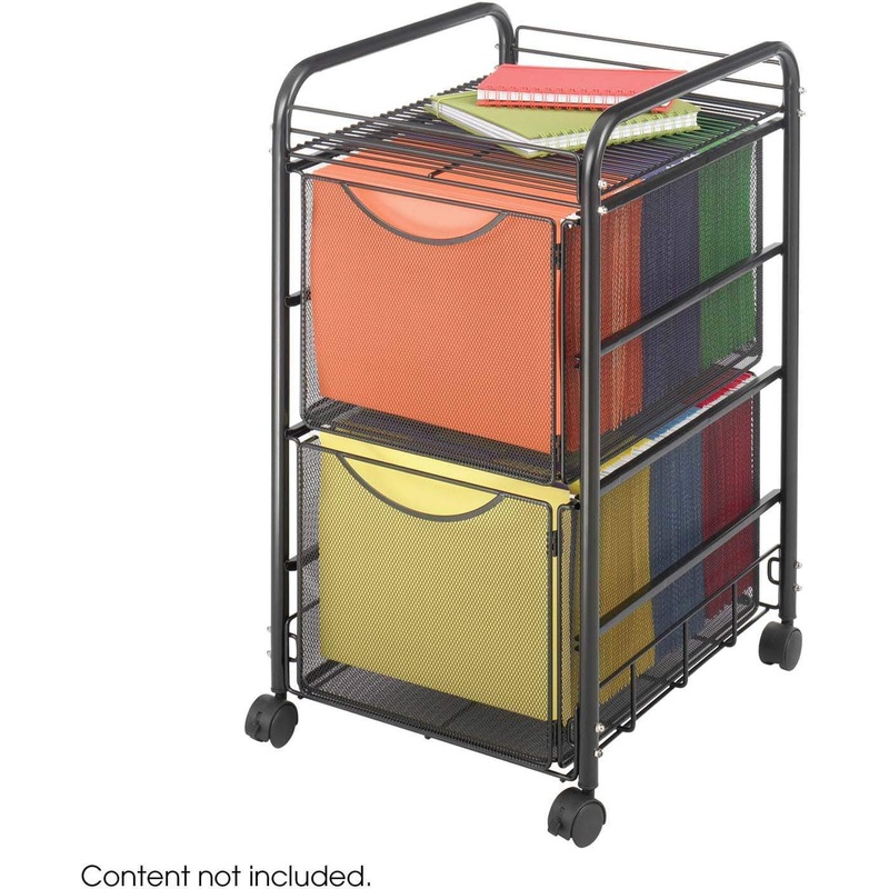 Stay organized with this Safco Onyx mesh file cart. Featuring two file drawers and a top shelf, it allows for plenty of storage and holds hanging folders for ultimate organization. Made with a steel frame, this file cart is designed for durability, and it also features locking wheels for easy transportation.