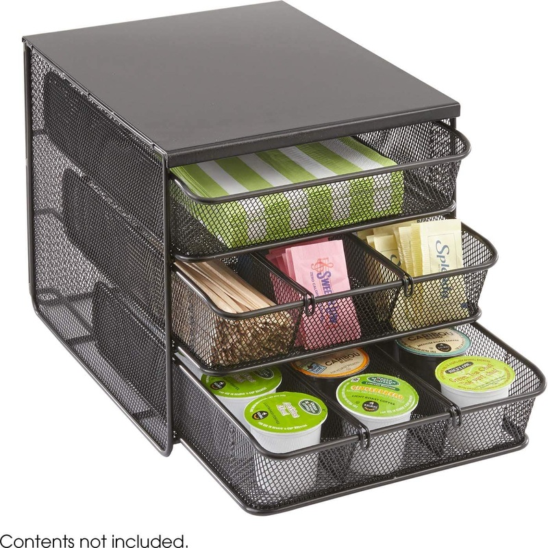 Features:3 drawer organizerCoffee pod and break room supply storageThree tiers of removable dividersHolds K-Cup coffee pods and other break room suppliesSpecifications: Material: SteelColor: BlackGreenguard: YesCompartment Type: ItemFinished Product Dimens