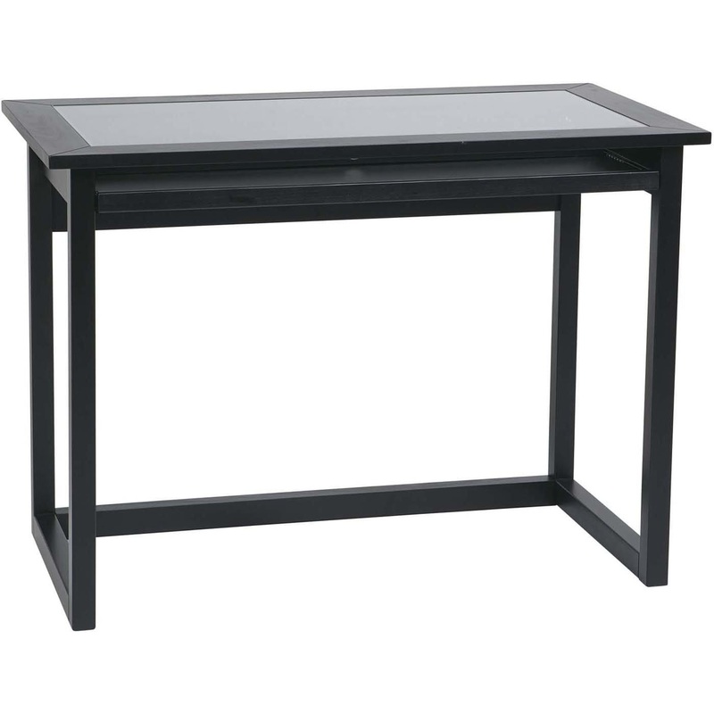 Features:Computer DeskClean, contemporary design complements most any decorMade of select veneers and wood solids, finished in a beautiful Ebony finish.Tempered clear glass in solid wood frame top shelfFull width keyboard pull-out provides an additional wo