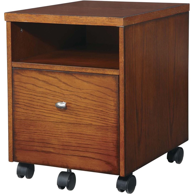 Add a touch of classic, time honored style with this transitional Aurora Wood & Veneer Mobile File Cabinet. An amalgamation of a traditional aesthetic and intuitative design, this 5-caster wheel file chiffonier is perfect for storing both letter and legal sized files keeping your important documents neat and organized for quick and easy retrieval. With no compromise to style, this beautiful oak finished home or office piece features a genius 5th wheel caster allowing for effortless mobility. The brilliant idea of the 5th wheel also prevents the cabinet from tipping forward when the easy-glide file drawer is fully open, making this piece safe and durable for years to come.