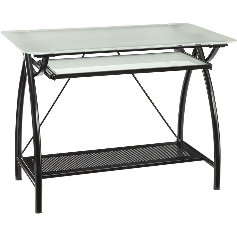 Features:Frosted tempered glass topBlack powder-coated steel framePullout keyboard trayLower storage shelfReady to assembleIntended for residential use onlyOuter Materials: Frosted Tempered Glass Top, BLK Powder Coated Steel FrameFinish: BlackDimensions: O