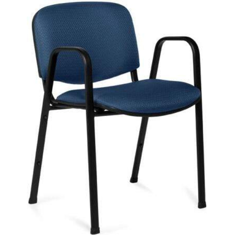 These fabric upholstered stack chairs from Offices To Go are an ideal space-saving seating solution for any guest, reception, conference, or waiting room. Features include durable stain-resistant fabric upholstery available in your choice of (4) different colors, foam padded seat and backrest cushions, frame integrated loop arms, black epoxy powder coated frame finish, and four post legs with protective plastic end caps. Optional transport/storage dolly available. Stackable up to 4 chairs high on optional dolly. Available with no arms for space or style preference. This chair meets or exceeds ANSI/BIFMA standards.