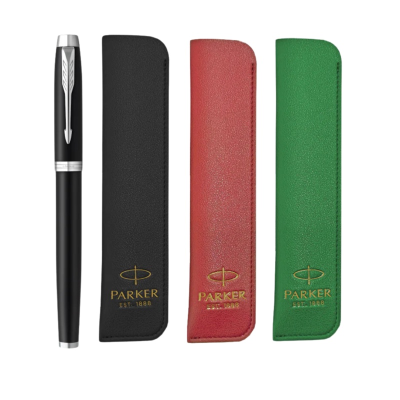 Elevate your writing experience with the Parker IM Rollerball Pen in a sophisticated matte black finish accented with sleek chrome trims. The streamlined design, paired with the effortless smoothness of a rollerball tip, ensures precise, skip-free writing for professionals and students alike. Complemented by a premium pen sleeve in black, red, and green, this gift set embodies modern elegance and timeless craftsmanship.