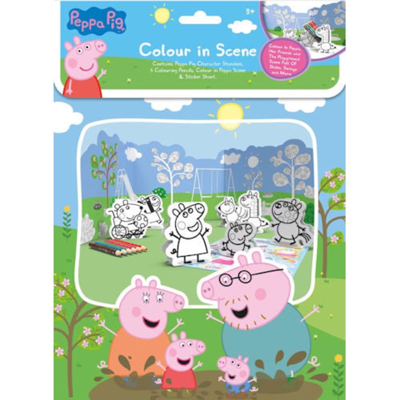 Peppa Pig Colour-In Scene: Bring Peppa Pig's world to life with this fun and interactive colouring set, perfect for little artists. Complete Set: Includes Peppa Pig character standees, 6 colouring pencils, a colour-in scene, and a sticker sheet for added c