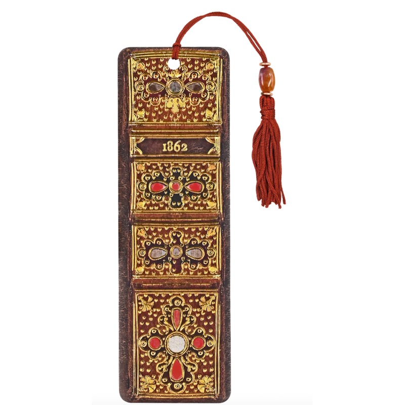 Elegant bookmark depicts the spine of an antique book!Attached: A silky tassel with hand-selected accent beads.Premium bookmark is printed on sturdy, smooth-finish card stock.Design is embellished with gold foil highlights.Bonus utility on the back: A hand