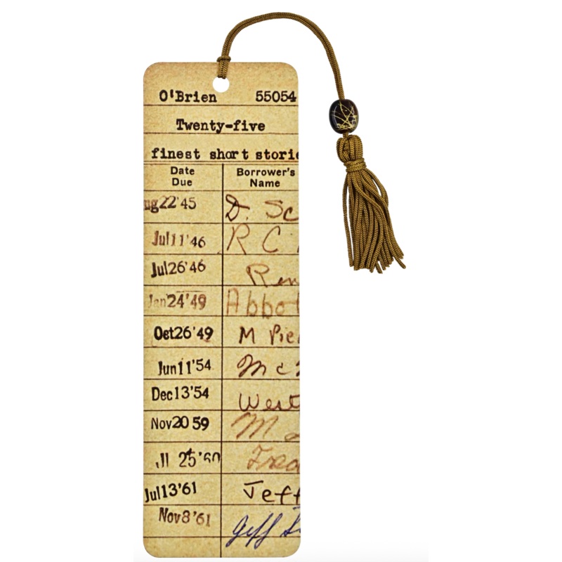 Fun beaded bookmark brings back the nostalgia of hand-stamped, hand-recorded library cards!Attached: A silky tassel with a matching accent bead.Bookmark is printed on sturdy, smooth-finish card stock.Design is embellished with gloss highlights.Bonus on the