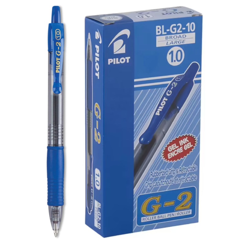 Australia's Go-2 Gel Ink Rollerball Pen in Blue - 1 Dozen Box.This blue gel rollerball pen features the broad 1.0mm tip for large clear writing.Discover the smooth writing and comfortable G-2, Australia's favourite Gel Ink Rollerball Pen. The Pilot G-2 gel