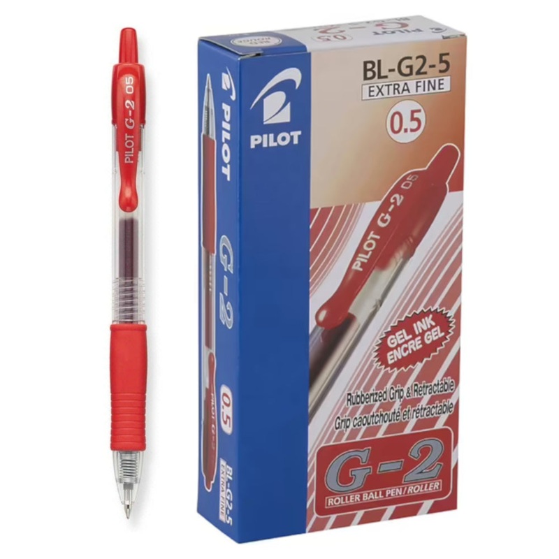 Australia's Go-2 Gel Ink Rollerball Pen in Red - 1 Dozen Box.This red gel rollerball pen features the extra fine 0.5mm tip for very fine writing.Discover the smooth writing and comfortable G-2, Australia's favourite Gel Ink Rollerball Pen. The Pilot G-2 ge