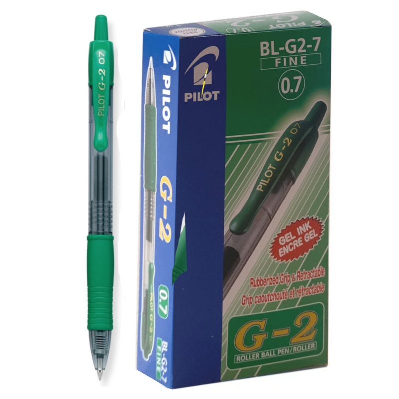 Australia's Go-2 Gel Ink Rollerball Pen in Green - 1 Dozen Box.This green gel rollerball pen features a fine 0.7mm tip for everyday writing.Discover the smooth writing and comfortable G-2, Australia's favourite Gel Ink Rollerball Pen. The Pilot G-2 gel ink