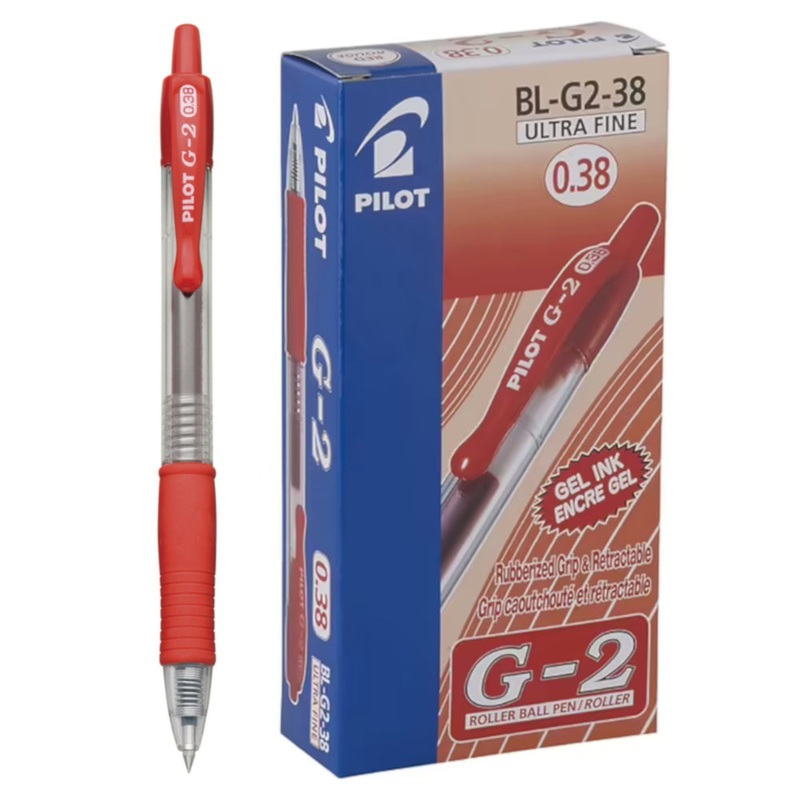 Australia's Go-2 Gel Ink Rollerball Pen in Red - 1 Dozen Box.This red gel rollerball pen features the ultra-fine 0.38mm tip for very fine writing.Discover the smooth writing and comfortable G-2, Australia's favourite Gel Ink Rollerball Pen. The Pilot G-2 g