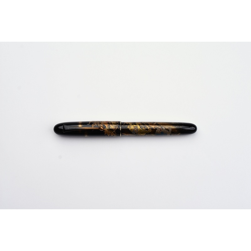 The pens in Namiki’s Yukari Royale Collection feature elegant designs on a large ebonite body and size #20 18k gold nib. The motifs are created through the highly advanced Togidashi-Taka Maki-e technique(Burnished-Raised Maki-e), alsoapplied in the creation of pens in Namiki’s Emperor collection. First, Togidashi Maki-e (Burnished Maki-e) is used; the background and scenery are painted with lacquer, which are then sprinkled with gold or silver powder and sealed withUrushi lacquer. After drying, the surface is lightly burnished with charcoal, revealing the design underneath. Then, the main design is further rendered through additional use of materials like lacquer and charcoal powder. Finally, Hira-Maki-e (Flat Maki-e) is usedto create thelast details with layers of metal powder and lacquer. (The Pilot-Namiki website also provides a fascinatingpeekinto the steps of the processhere.)