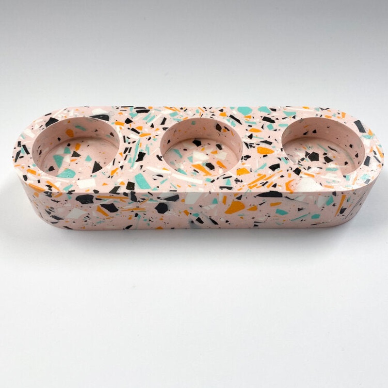 TheSherbet collection by Emily Marlinare a pop of colour that will enhance any entertaining experience.Colours include, pink, orange, black and mint.Handmade in the UK this collectionis made from the material jesmonite. Sealed with a stone guard sealant wh
