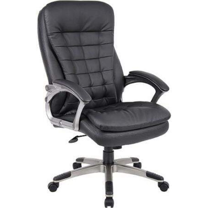 This high back executive chair from Boss Office Products features a patented ribbed, pillow top cushion over both the seat and backrest for maximum comfort. Other features include thick, molded foam cushions, durable yet soft faux leather CaressoftPlus uph