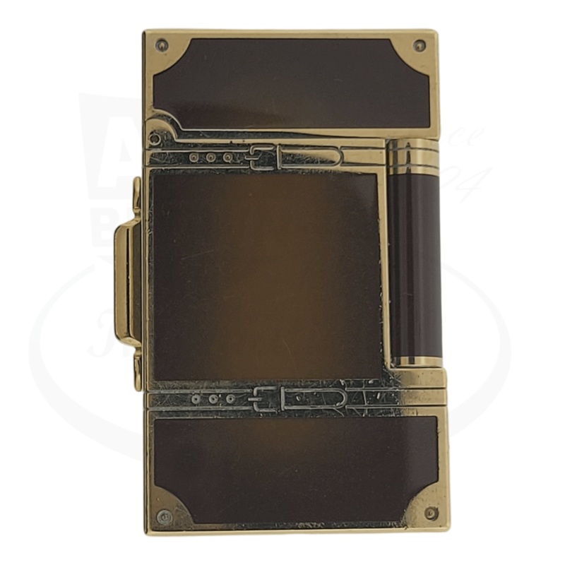 Made of brass with yellow gold finishes, the lighter offers one of our most innovative lacquering effect, the sun burst, in a shade of intense brown to pal brown. The details inspiration on the lighters have been taken from our old mallettes when the packa
