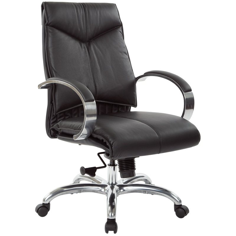 With natural attraction, comfort, and elegance, this leather office chair conveys professionalism with a sophisticated look for any executive office suite. The contoured seat and back have black leather covering along with lumbar support. The base glistens with a chrome finish. Dual wheel casters slide beautifully to ensure smooth transportation.