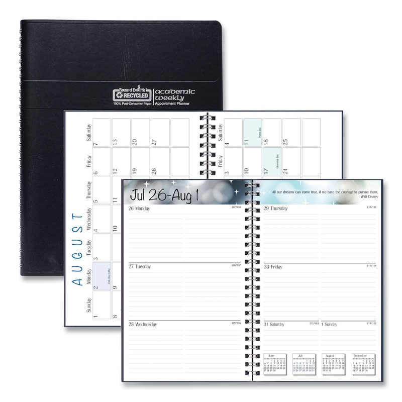 Memo-sized book is perfect for use in the office, the classroom or on the go. Ruled, open appointment times for flexible scheduling with a monthly planning section as well as academic and environmental information pages. Includes a double-sided storage pocket. Each weekly spread features a quote or “word of the week”, common formulas and exam/quiz/project-record space. Made entirely of recycled materials. Dated/Undated: Dated; Calendar Format: Weekly; Monthly; Calendar Spread Format: One Week per Two-Page Spread; One Month per Page; Edition Year: 2023 to 2024.
