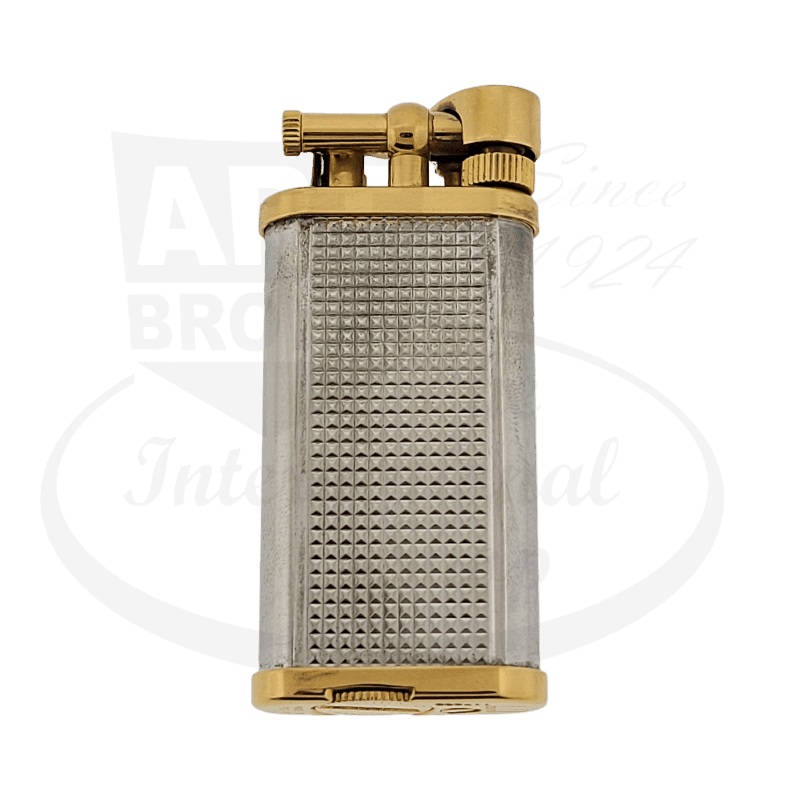 This is a refurbished vintage hammer style Dunhill lighter in duo tone. The lighter is in great working condition with visible marks and tarnishing on the body. Hard to find piece made in England. Sold with the original box and paperwork. Covered by a 1-year warranty with Art Brown International