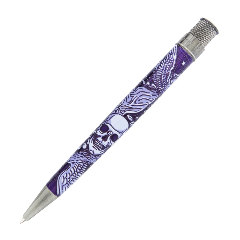This Tornado Exclusive uses a combination of intricate acid-etching plus printing to highlight the key features against the purple lacquered barrel. It is finished with antique silver accents and topped with Pallas on the finial. This is a limited edition of 575 rollerballs with each top ring engraved revealing its number. They are packaged in a Retro tube with matching graphics to store or display on your desk. Grab the Raven at Pen Boutique before it is Nevermore.