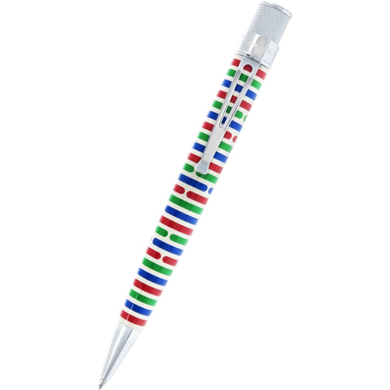 In honor of the first three Tornado pens, Retro 51 pen is made up of a series of horizontal lines cascading down the cream barrel in the three original colors. The pen is finished with chrome accents and afinial that includes the same style as the barrel with a red 25 in the center.