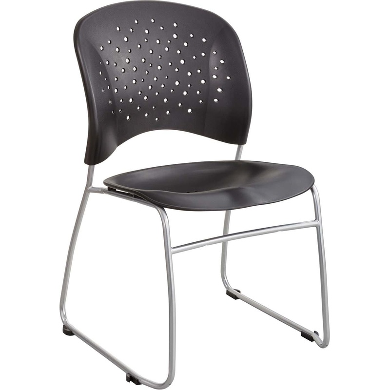 Features:Stackabble Guest ChairRound backSilver baseGanging connector glidesGuest chairs stack up to 12 high with sled baseSpecifications: Color: BlackAssembly Required: NoGreenguard: YesBack Size: 18"W x 13 "HCapacity Weight: 250 lbs.Compartment Type: Ite