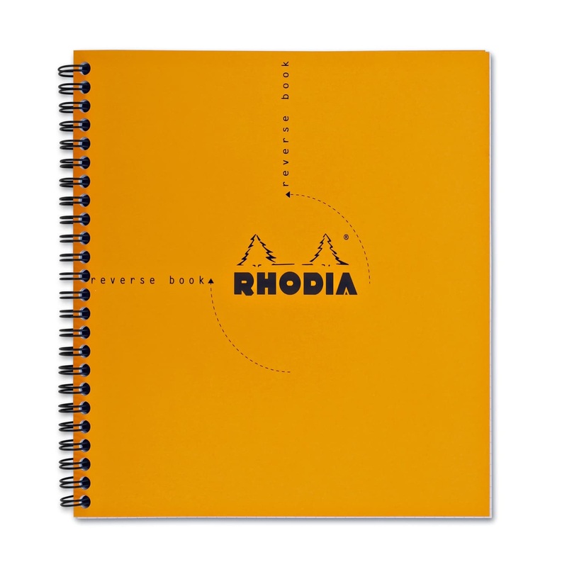 This Rhodia Wirebound Reverse Notebook features 80g smooth extrawhite Rhodia paper with waterproof orange or black coated cover. Doublewire-binding for strength and no snag. Stiff cardboard backing providessupport for writing and sketching on the go. Fount