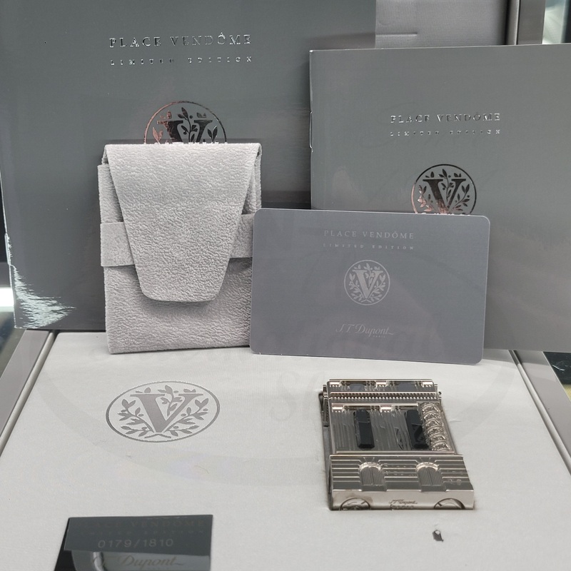 Released in 2008, the S.T. Dupont Place Vendme Limited Edition Lighter pays tribute to the architectural splendor of one of Pariss most distinguished squares. Limited to just 1,810 pieces, this Line 2 lighter is clad in a platinum finish and features genuine hematite stone inlaysdesigned to evoke the stately faade and columned elegance of Place Vendme. The detailed engraving and dimensional construction reflect S.T. Duponts master craftsmanship and precision.