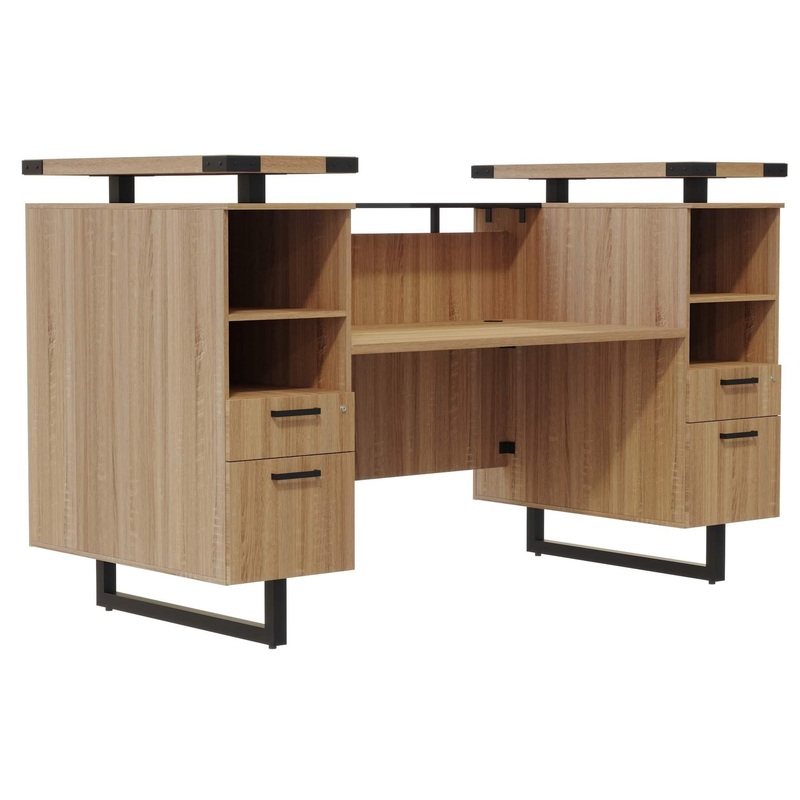 Mirella Reception Desk with Glass Countertop features a contemporary design that provides a residential look, complemented with Brushed-Silver or Black Powder Coat accents and finishes. Sand Dune and Southern Tobacco laminates come with Black hardware and Smoked Glass, and White Ash and Stone Gray laminates coome with Silver hardware and Frosted Glass. Features floating glass countertops on Silver or Black standoffs. The thick tempered-glass reception counter and the 1 thick laminate desktop are sure to convey the right message to all of your companys visitors. Includes laminate modesty panel for additional privacy, and center drawer. Comes complete with double, shelf/box/file pedestals for all your storage needs. Coordinates with Mirella Desking and Conference designs for a cohesive and professional look..