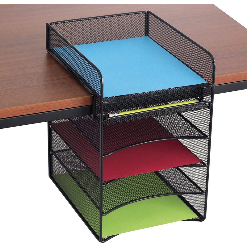The Onyx horizontal hanging storage unit is a wire mesh organizer that easily attaches to a desktop and hangs below it, providing underdesk storage that saves space and time. Features one desktop tray and four underdesk trays for sorting letter-size docume