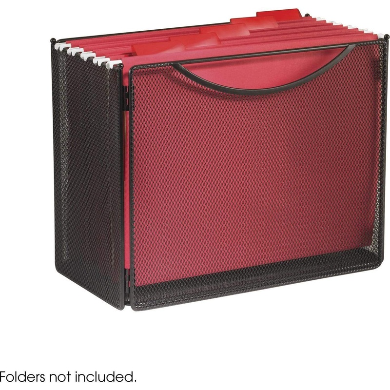 The Onyx Mesh Desktop Box File is an open-top desk organizer for letter-size hanging files. It is built with a steel mesh design and a durable black powder coat finish. This desktop file box easily collapses for storage.Product Features: Open top for lette