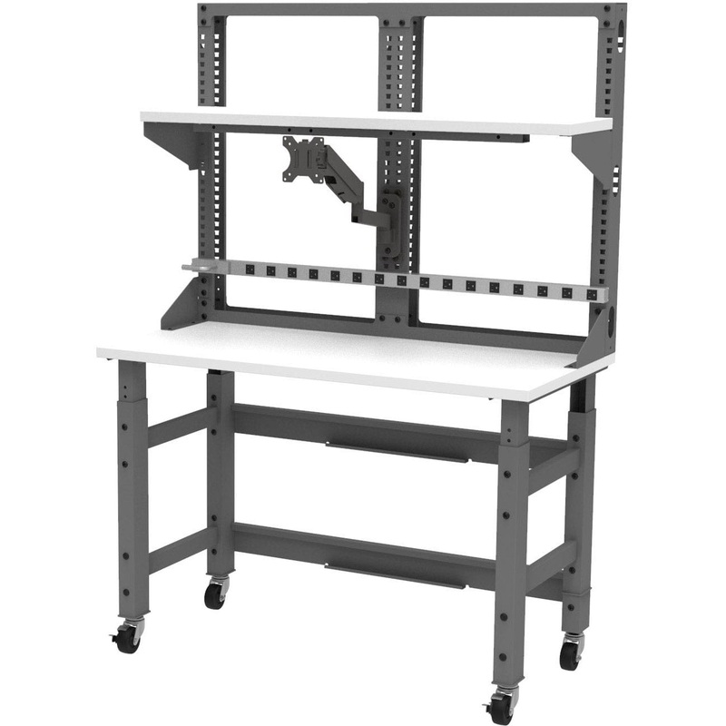 TechWorks Typical #2 features a 48x24 adjustable height workbench with high pressure laminate (HPL) worksurface, upper organizer frame with a fixed shelf and single screen monitor arm. The heavy-duty caster kit provides easy mobility, and a 15 amp power st