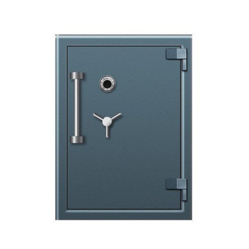 Security features include a U.L.-listed Group II key-changeable combination lock with a spring-loaded relocking device that activates in the event of an attack. Other lock options are available for an upgrade, including electronic locks, multi-user, audit trail, or high-security Group 1R locks. The lock and relockers are protected by a drill-shattering composite hard plate, while a handle-activated locking mechanism secures the door with three massive 1-1/2″ solid steel bolts. Finished in a professional powder-coated blue, this 1950-pound safe is ideal for both commercial and residential environments where security is a top priority.