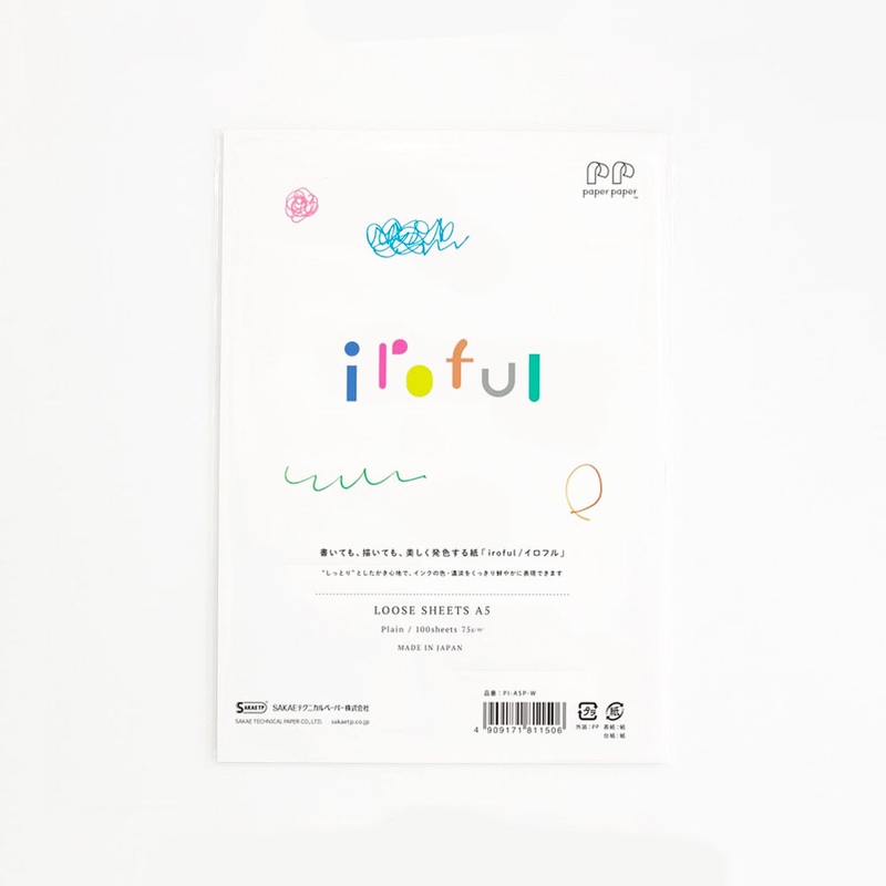 Pack of 100 loose sheets of white plain 75gsm fountain pen friendly Sakae TP Iroful paper. The sheets are resistant to bleed-through and feathering, can handle a variety of inks, and are acid-free.Iroful Paper - Sakaes newest product in development aimed a