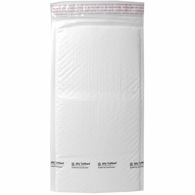 Jiffy Tuffgard Premium Cushioned Mailers are made from puncture-resistant, water-resistant, tamper-resistant poly with a clean, white textured surface for secure label application. Heat-seal seams will not burst. Mailers have a 3/16″ high, Barrier Bubble layer for maximum cushioning. Use easy closure to seal. Simply peel away the liner and seal. Mailers are lightweight to save on postage.