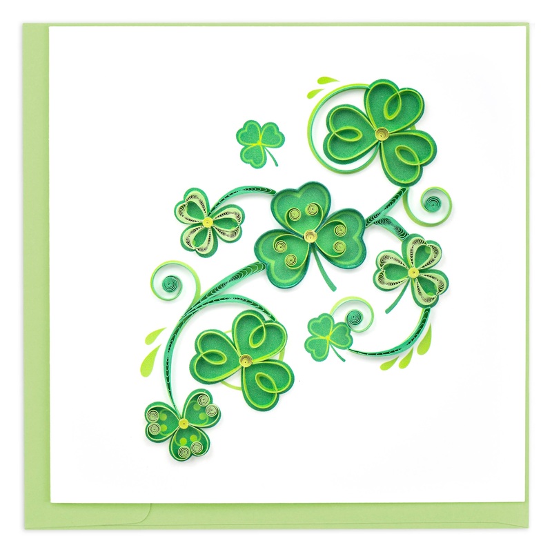 Send Irish cheer this year with the Quilled Shamrock Greeting Card! A wonderful choice to celebrate St. Patricks Day. The front of this card is decorated with a variety of green quilled shamrocks and swirls.