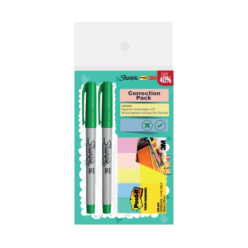 Sharpie Ultra Fine Green Marker 2s & Post-it Page Marker 5 Pads 15mm x 50mm | Sharpie X 3M Correction Pack |Enhance your organization and creativity with the Sharpie Ultra Fine Green Marker 2s and Post-it Page Marker 5 Pads 15mm x 50mm, all in one convenie