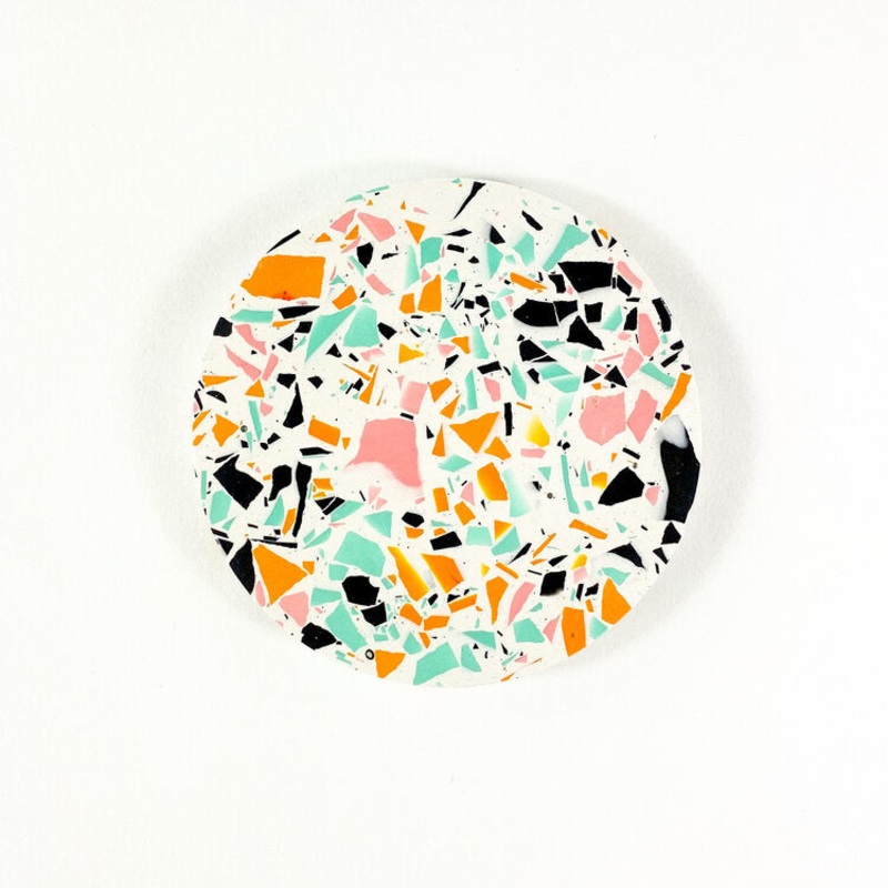 TheSherbet collection by Emily Marlin features a fun colour palette ofpink, orange, black and mint.Handmade in the UK this collection of round coasters and placemats are made from the material jesmonite. Sealed with a stone guard sealent which makes them s