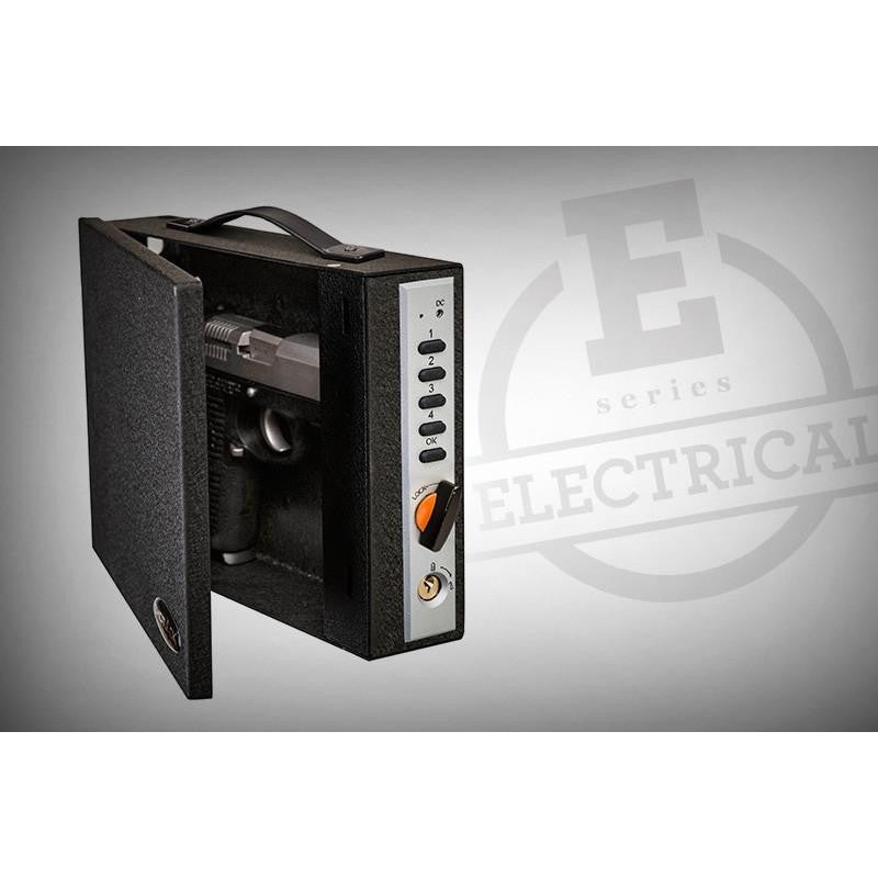 ShotLock Handgun 200E (Electromechanical)Handgun Solo-Vault is made of military grade 14-gauge steel. Features include a flanged no pry lid, double internal locking hooks, carry handle, protective felt inner liner, with key override and no break lock clutc