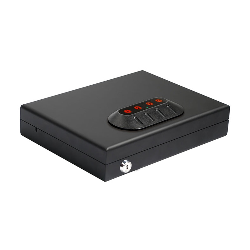 The outside is protected by a fully programmable four-button electronic lock. You can select your own custom combination anywhere from 3-8 digits. The touch pad is backlit illuminated in red for easy access in the dark. The buttons make a sound when pressed but can be muted if you choose. A tamper indicator will also alert you if someone tries to break into the handgun vault. Two override keys are provided in case the batteries die, or something happens to the lock.
