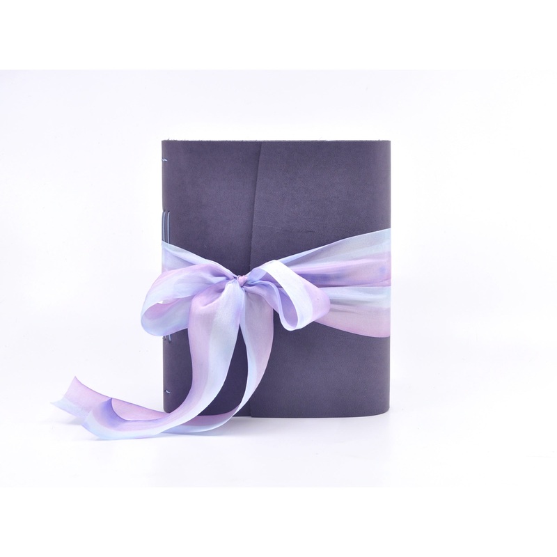 The journal is finished with a flap and a lavender/blue dip dyed silk ribbon that ties around the book block to hold the cover closed when you are not writing.