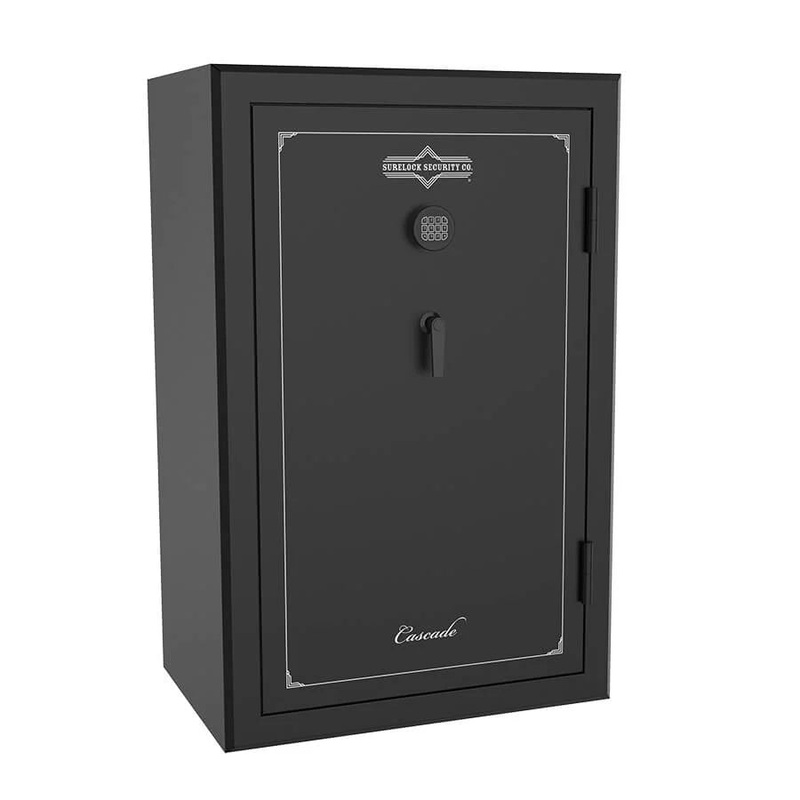 With a 14-gauge steel door and body and seven locking bolts (four active, three dead) 1″ in diameter, the Surelock Cascade 48 Gun Safe is designed to keep your firearms and valuables safe and secure. The matte black finish adds a sleek and modern touch to the exterior, while the beveled edges give it a distinctive look.