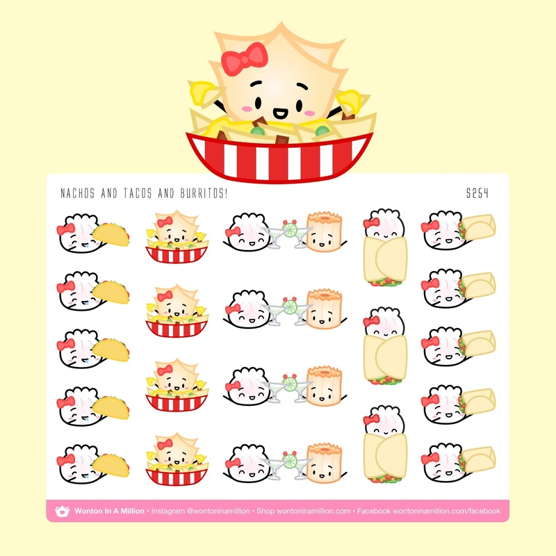 Decorate your planners, scrapbooks, bullet journals and more with this adorable sticker sheet featuring the Shrimp Dumpling family! It’s said that to judge the skill of a dimsum chef, you look at how they’ve made a shrimp dumpling: its skin should be translucent but not break when you pick it up, and the skin shouldn’t stick to the steamer or to the other shrimp dumplings in the basket. Shrimp dumplings are a MUST HAVE at dimsum (and in your sticker collection!)