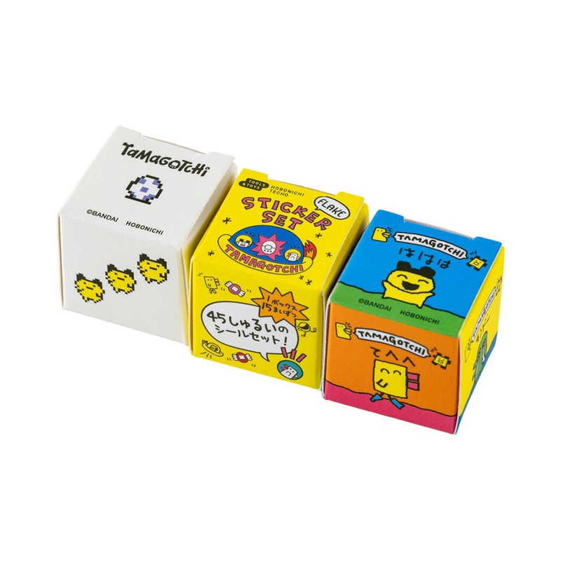 This set of 3 sticker boxes offers 45 nostalgic designs drawn from the legendary pocket pets. A mix of holographic pixel art, short phrases and retro designs, the Tamagotchi Flake Stickers are an emphatic tribute to the 30th anniversary of a classic toy.
